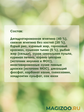 Дегидратированная ягнятина (40 %), свежая ягнятина без костей (20 %), бурый рис, куриный жир, гороховый крахмал, сушеная тыква (5 %), рыбий жир (сельди), сухая свекольная пульпа, куриная печень, корень цикория (источник инулина и ФОС), инактивированные сухие пивные дрожжи (источник МОС), дикальций фосфат, карбонат калия, глюкозамин, хондроитин сульфат, сок юкки.
