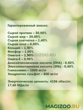Мясо — ингредиент №1 в составе (50-55 %). Содержится как свежее, так и дегидратированное мясо, что гарантирует превосходный вкус и высокое качество белков животного происхождения.