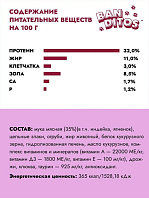 Добавки: Витамин А – 24000 МЕ/кг, витамин D3 – 2000 МЕ/кг, витамин Е – 500 мг/кг, таурин – 1500 мг/кг.