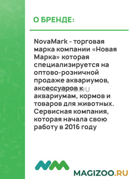 NovaMark - торговая марка компании «Новая Марка» которая специализируется на оптово-розничной продаже аквариумов, аксессуаров к аквариумам, кормов и товаров для животных. Сервисная компания, которая начала свою работу в 2016 году.