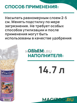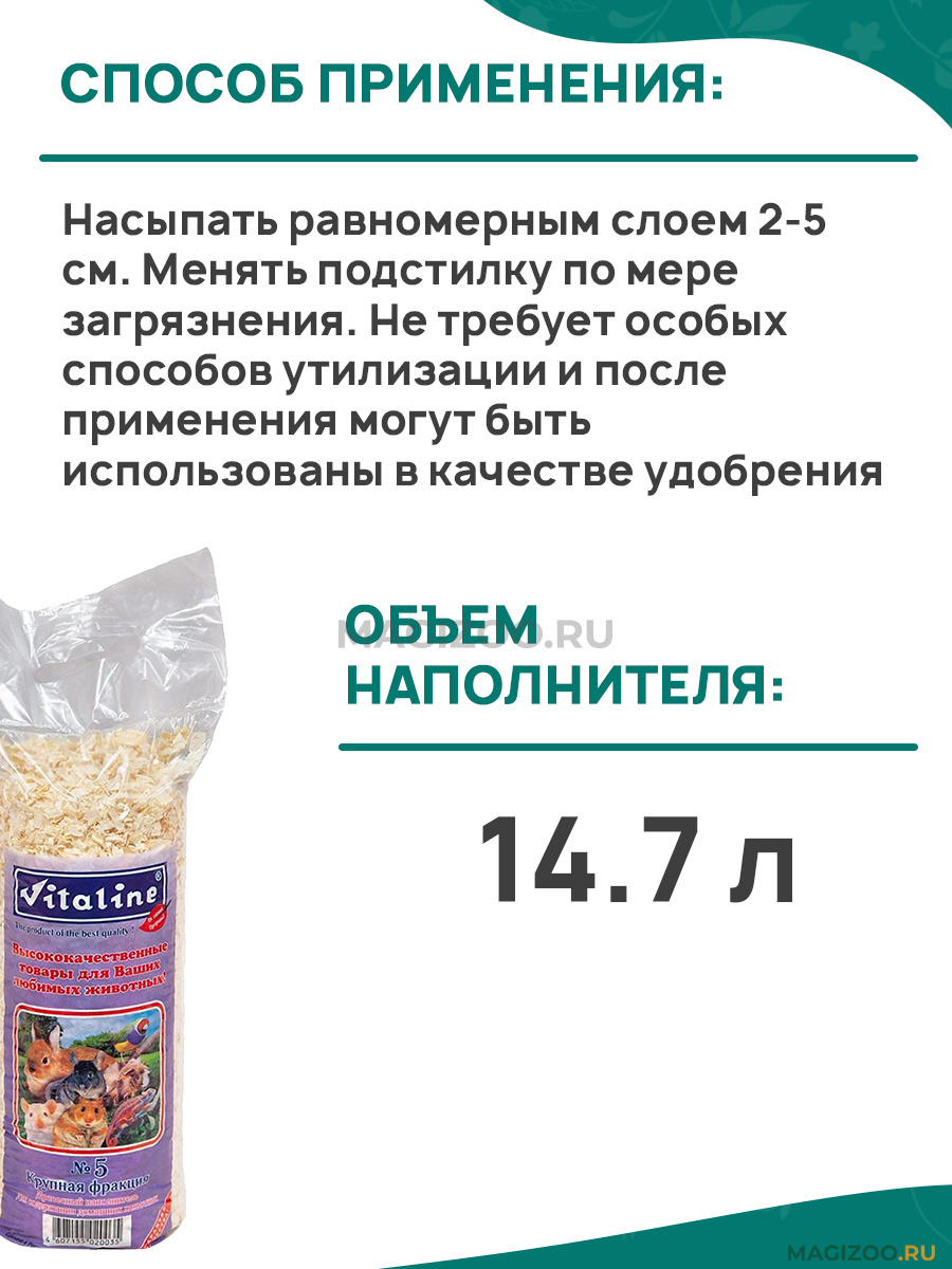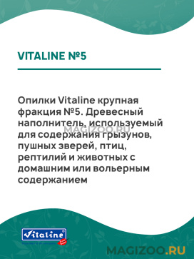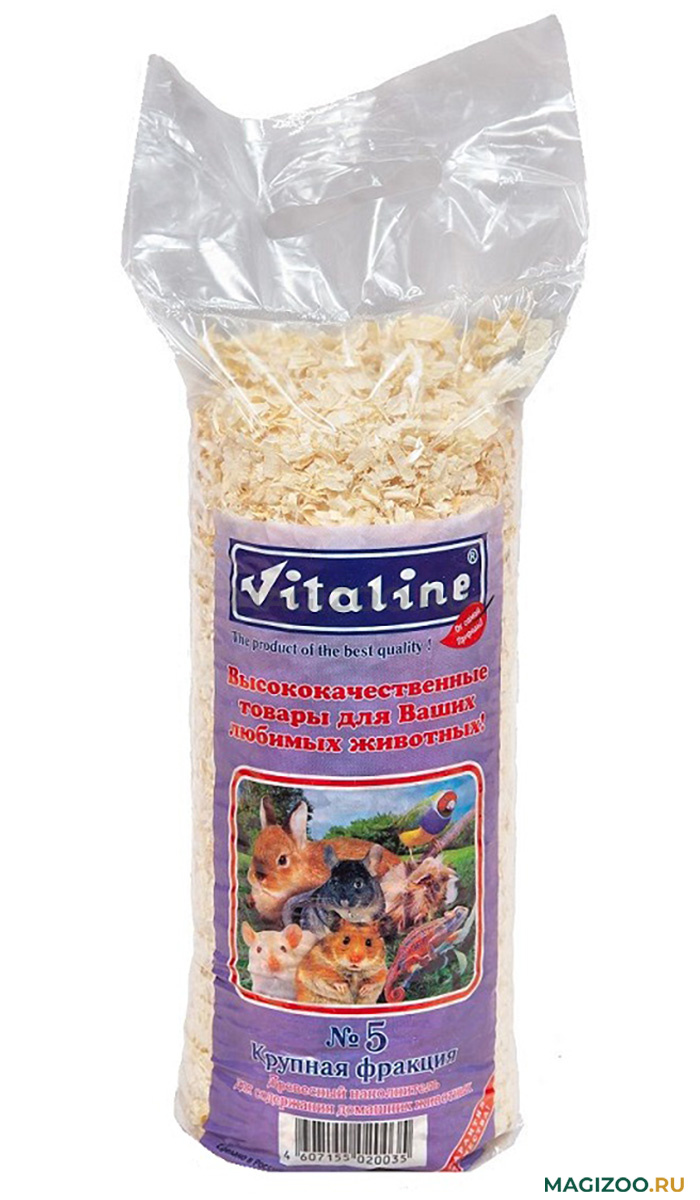 Опилки Vitaline крупная фракция №5. Древесный наполнитель, используемый для содержания грызунов, пушных зверей, птиц, рептилий и животных с домашним или вольерным содержанием.