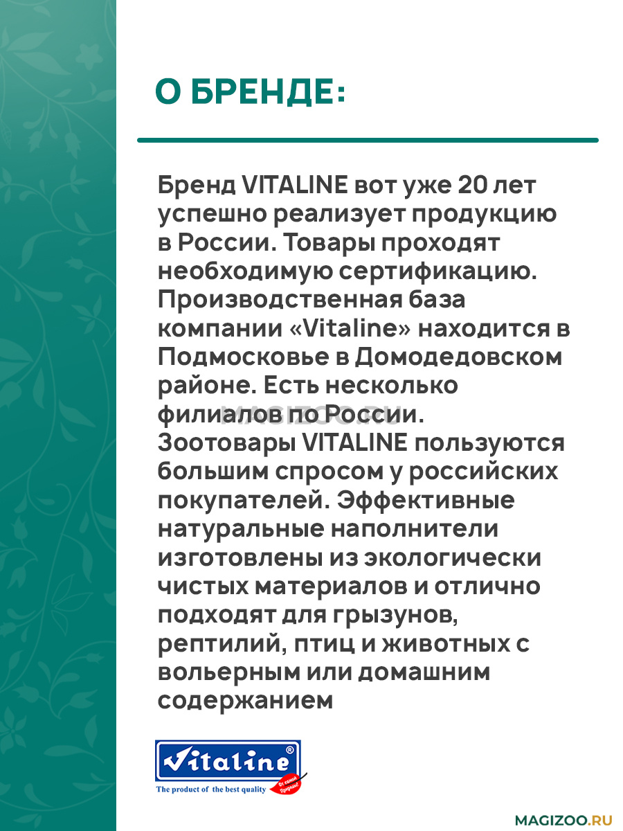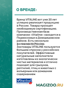Зоотовары VITALINE пользуются большим спросом у российских покупателей. Эффективные натуральные наполнители изготовлены из экологически чистых материалов и отлично подходят для грызунов, рептилий, птиц и животных с вольерным или домашним содержанием.