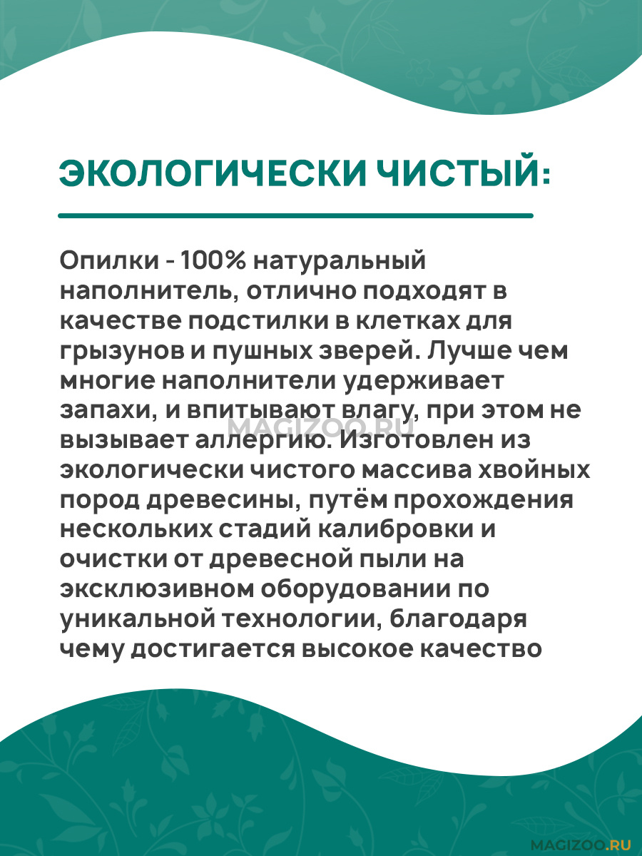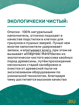 Опилки - 100% натуральный наполнитель, отлично подходят в качестве подстилки в клетках для грызунов и пушных зверей. Лучше чем многие наполнители удерживает запахи, и впитывают влагу, при этом не вызывает аллергию. Изготовлен из экологически чистого массива хвойных пород древесины, путём прохождения нескольких стадий калибровки и очистки от древесной пыли на эксклюзивном оборудовании по уникальной технологии, благодаря чему достигается высокое качество.