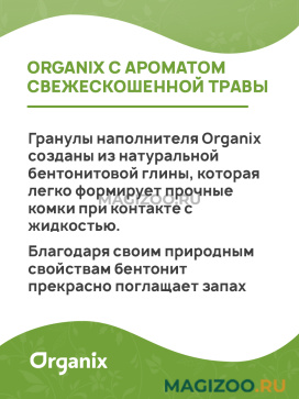 Гранулы наполнителя Organix созданы из натуральной бентонитовой глины, которая легко формирует прочные комки при контакте с жидкостью. Благодаря своим природным свойствам бентонит прекрасно поглащает запах.