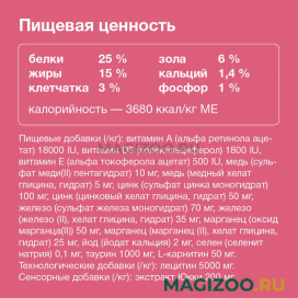 Витамин A (альфа ретинола ацетат) – 18000 мг, витамин D3 (холекальциферол) – 1 800 мг, витамин E (альфа ретинола ацетат) – 500 мг, медь (сульфат меди(II)пентагидрат) – 10 мг, цинк (сульфат цинка моногидрат) – 100 мг, железо (сульфат железа моногидрат) – 70 мг, марганец (оксид марганца(II) – 50 мг, йод (иодат кальция) – 2 мг, селен (селенит натрия) 0, 1 мг, таурин - 1000 мг, L-карнитин - 50 мг.