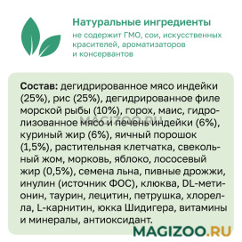 Дегидрированное мясо индейки (25 %), рис (25 %), дегидрированное филе морской рыбы (10 %), горох, маис, гидролизованное мясо и печень индейки (6 %), куриный жир (6 %), яичный порошок (1,5 %), растительная клетчатка, свекольный жом, лососевый жир (0,5 %), семена льна, пивные дрожжи, инулин (источник ФОС), клюква, DL-метионин, таурин, лецитин, петрушка, хлорелла, L-карнитин, юкка шидигера (yucca schidigera), витамины и минералы, антиоксидант.