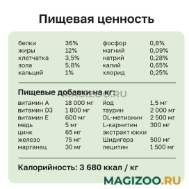 Корм изготовлен из тщательно отобранных натуральных ингредиентов высокого качества и НЕ содержит никаких искусственных добавок, консервантов, ГМО, а так же пшеницу и сою.