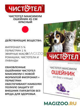 Чистотел Максимум ошейник применяют для уничтожения блох, вшей, власоедов и иксодовых клещей, паразитирующих на щенках и котятах старше 4-месячного возраста, а также для защиты животных от их нападения, особенно в теплое время года (в период повышенной активности паразитов).