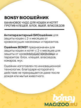 Ошейник BONSY предназначен для защиты кошек и котят с 2-х месяцев для защиты от кровососущих насекомых и паразитов: блох, клещей, власоедов, комаров, мух.