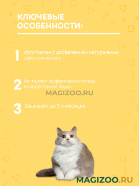 Ошейник изготовлен по инновационной технологии, благодаря которой его действие не прекращается даже после дождя или мытья животного.