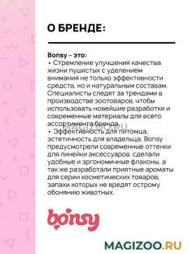 • Эффективность для питомца, эстетичность для владельца. Bonsy предусмотрели современные оттенки для линейки аксессуаров, сделали удобные и эргономичные флаконы, а так же разработали приятные ароматы для серии косметических товаров, запахи которых не вредят острому обонянию животных.