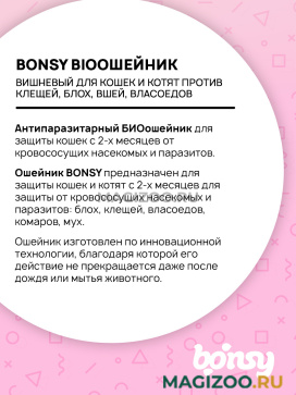 Ошейник BONSY предназначен для защиты кошек и котят с 2-х месяцев для защиты от кровососущих насекомых и паразитов: блох, клещей, власоедов, комаров, мух.