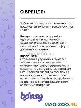 • Эффективность для питомца, эстетичность для владельца. Bonsy предусмотрели современные оттенки для линейки аксессуаров, сделали удобные и эргономичные флаконы, а так же разработали приятные ароматы для серии косметических товаров, запахи которых не вредят острому обонянию животных.