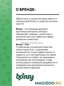 • Эффективность для питомца, эстетичность для владельца. Bonsy предусмотрели современные оттенки для линейки аксессуаров, сделали удобные и эргономичные флаконы, а так же разработали приятные ароматы для серии косметических товаров, запахи которых не вредят острому обонянию животных.