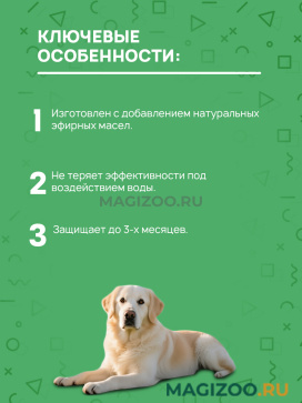 Ошейник изготовлен по инновационной технологии, благодаря которой его действие не прекращается даже после дождя или мытья животного.
