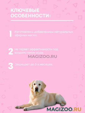 Ошейник изготовлен по инновационной технологии, благодаря которой его действие не прекращается даже после дождя или мытья животного.