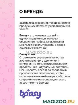 • Эффективность для питомца, эстетичность для владельца. Bonsy предусмотрели современные оттенки для линейки аксессуаров, сделали удобные и эргономичные флаконы, а так же разработали приятные ароматы для серии косметических товаров, запахи которых не вредят острому обонянию животных.