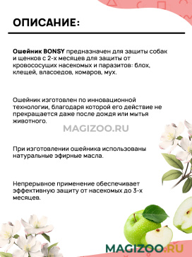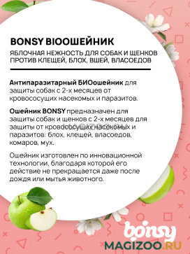 Ошейник BONSY предназначен для защиты собак и щенков с 2-х месяцев для защиты от кровососущих насекомых и паразитов: блох, клещей, власоедов, комаров, мух.