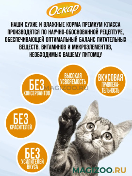 Информация о составе и ингредиентах, цветовом решении, технических и иных характеристиках, стране-изготовителе, внешнем виде и комплекте поставки товара носит справочный характер и основана на последних доступных к моменту публикации сведениях. Доставка данного товара осуществляется во все регионы РФ.Известный на сегодняшний день бренд ОСКАР - это результат сотрудничества России и Дании, которые создали высокотехнологичную линию сухих и консервированных кормов для домашних животных.