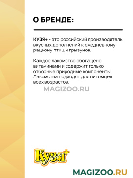 КУЗЯ ПЛЮС для попугаев – не только вкусное, но и полезное, обогащенное белками, витаминами и микроэлементами, лакомство, изготовленное из зёрен и мёда Алтая и Сибири с добавлением различных орехов.