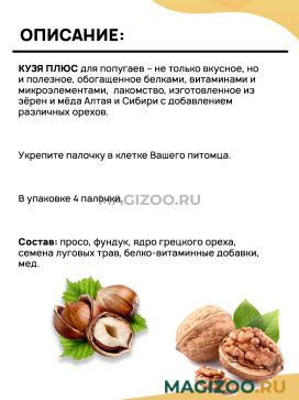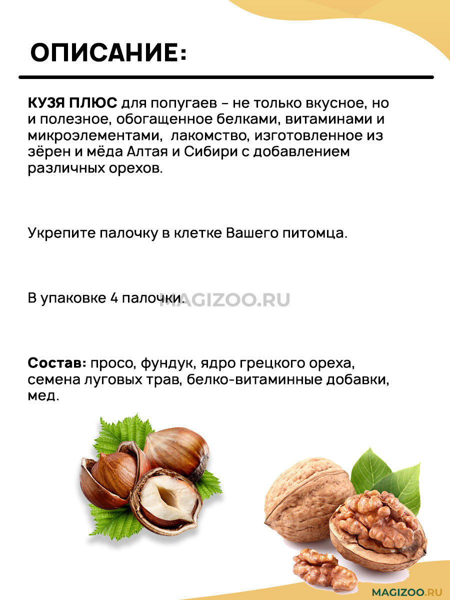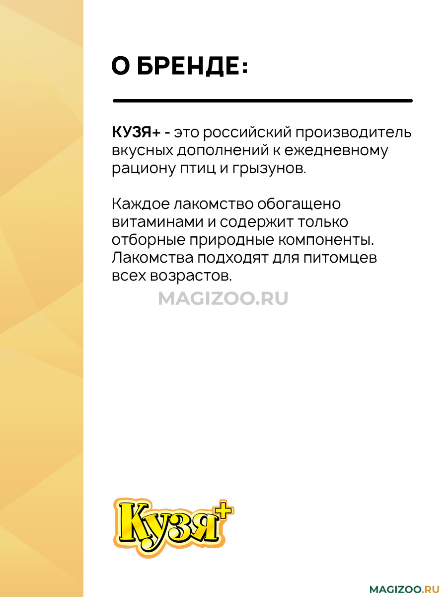 КУЗЯ ПЛЮС для попугаев – не только вкусное, но и полезное, обогащенное белками, витаминами и микроэлементами, лакомство, изготовленное из зёрен и мёда Алтая и Сибири с добавлением различных орехов.