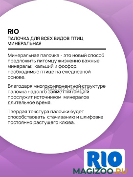 Ассортимент бренда RIO включает корма, специальные рационы, природные и оригинальные лакомства, витамины и добавки и средства по уходу для всех видов птиц. Всё для того, чтобы сделать жизнь птицы насыщенной̆ и доставить ее владельцу много ярких эмоций и удовольствие от общения с питомцем.
