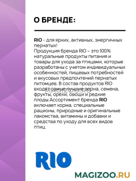 Информация о составе и ингредиентах, цветовом решении, технических и иных характеристиках, стране-изготовителе, внешнем виде и комплекте поставки товара носит справочный характер и основана на последних доступных к моменту публикации сведениях. Доставка данного товара осуществляется во все регионы РФ.Продукция бренда RIO – это 100% натуральные продукты питания и товары для ухода за птицами, которые разработаны с учетом индивидуальных особенностей, пищевых потребностей и вкусовых предпочтений пернатых питомцев. В состав продуктов RIO входят самые лучшие зерна, семена, фрукты, орехи, овощи и редкие плоды.