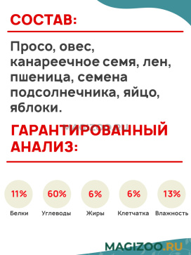 Просо, овес, канареечное семя, лен, пшеница, семена подсолнечника, яйцо, яблоки.