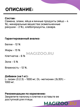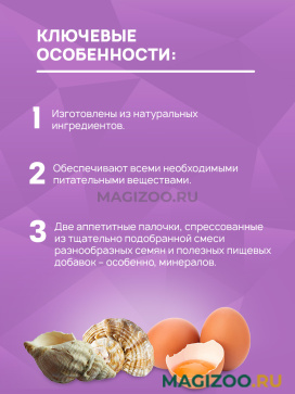 Рассыпчатые запеченные палочки с яйцом, аминокислотами и измельченными ракушками, дополнительное питание к обычному рациону птиц. Подходит для питания канареек и других птиц.