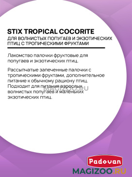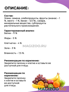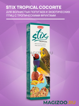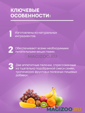 Рассыпчатые запеченные палочки с тропическими фруктами, дополнительное питание к обычному рациону птиц. Подходит для питания взрослых волнистых попугаев и маленьких экзотических птиц.