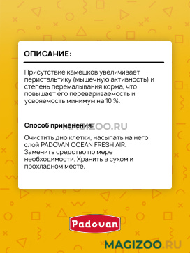 Очистить дно клетки, насыпать на него слой PADOVAN OCEAN FRESH AIR. Заменить средство по мере необходимости. Хранить в сухом и прохладном месте.