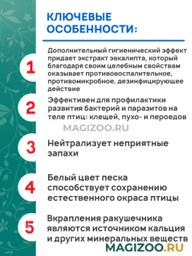- Белый цвет песка способствует сохранению естественного окраса птицы.