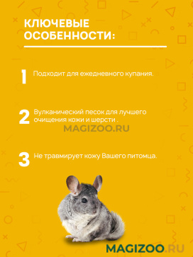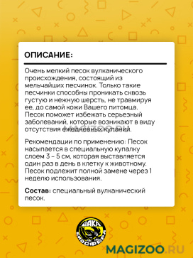 Очень мелкий песок вулканического происхождения, состоящий из мельчайших песчинок. Только такие песчинки способны проникать сквозь густую и нежную шерсть, не травмируя ее, до самой кожи Вашего питомца. Песок поможет избежать серьезный заболеваний, которые возникают в виду отсутствия ежедневных купаний.
