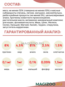 Состав: мясо, не менее 32% (говядина не менее 10%) и мясные субпродукты (печень, легкое, желудок), мясной бульон, рыба и рыбные продукты (не менее 5%), цельнозерновые злаки, протеины животного происхождения (гемоглобин, коллаген), растительное масло – источник полиненасыщенных жирных кислот, витаминно-минеральный комплекс для кошек (Вит. A, Д, Е, B1. B2, B3, B4, B5, B6, B12, фолиевая кислота, Медь, Цинк, Железо, Селен, Кальций, Магний, Калий), таурин, спирулина, загуститель каррагинан.