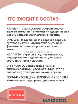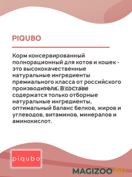 Информация о составе и ингредиентах, цветовом решении, технических и иных характеристиках, стране-изготовителе, внешнем виде и комплекте поставки товара носит справочный характер и основана на последних доступных к моменту публикации сведениях. Доставка данного товара осуществляется во все регионы РФ.Каждая упаковка Piqubo – это маленький шедевр, созданный радовать и питомца, и его хозяина. Снаружи – яркий дизайн и креативный формат. Внутри – только свежие и натуральные ингредиенты для активной и счастливой жизни ваших любимцев!