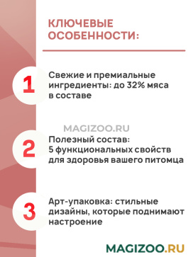 - Свежие и премиальные ингредиенты: до 32% мяса в составе.