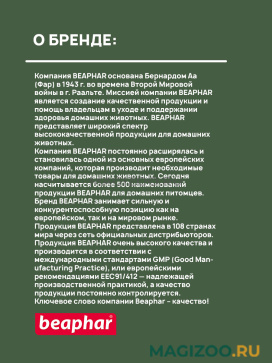 Информация о составе и ингредиентах, цветовом решении, технических и иных характеристиках, стране-изготовителе, внешнем виде и комплекте поставки товара носит справочный характер и основана на последних доступных к моменту публикации сведениях. Доставка данного товара осуществляется во все регионы РФ.Компания BEAPHAR постоянно расширялась и становилась одной из основных европейских компаний, которая производит необходимые товары для домашних животных. Сегодня насчитывается более 500 наименований продукции BEAPHAR для домашних питомцев.