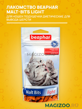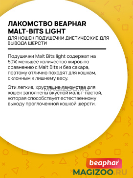 Подушечки Malt Bits light содержат на 50% меньшее количество жиров по сравнению с Malt Bits и без сахара, поэтому отлично походят для кошкам, склонным к лишнему весу.