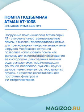 Погружные помпы (насосы) Atman серии AT - это очень качественные водяные помпы, с высокой производительностью, для пресноводных и морских аквариумов и прудов. Удобная конструкция позволяет использовать помпы как фильтры для очистки воды и обогащения ее кислородом, для создания течения воды в аквариумах, подачи воды для фонтанов, водопадов, ручьев и других декоративных элементов, террариумах, прудах, в качестве нагнетателей для проточных фильтров и УФ-стерелизаторов.