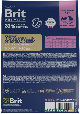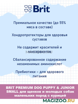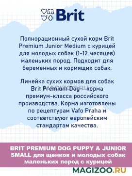 Полнорационный сухой корм Brit Premium Junior Medium с курицей для молодых собак (1-12 месяцев) маленьких пород. Подходит для беременных и кормящих собак.