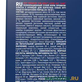 Полнорационный корм с курицей для взрослых собак крупных и гигантских пород весом от 25 до 90 кг.