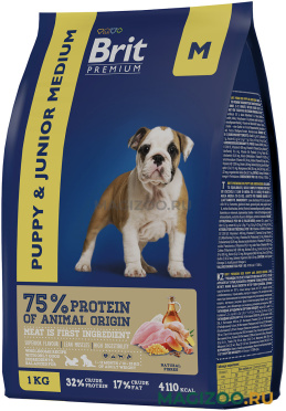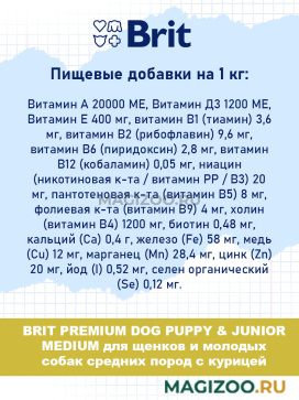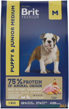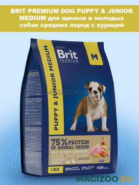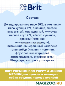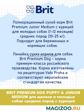 Полнорационный сухой корм Brit Premium Junior Medium с курицей для молодых собак (1-12 месяцев) средних пород (10-25 кг). Подходит для беременных и кормящих собак.