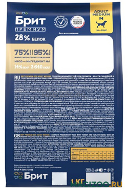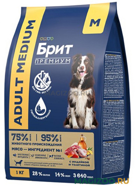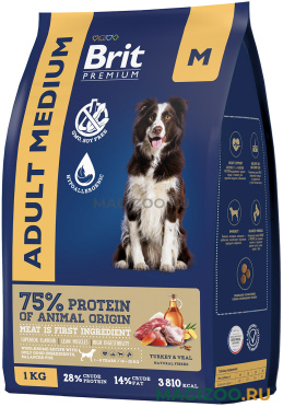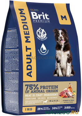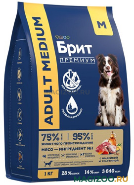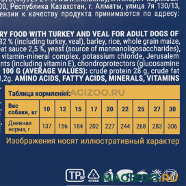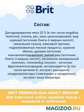 Полнорационный корм с индейкой и телятиной для взрослых собак средних пород весом от 10 до 25 кг.