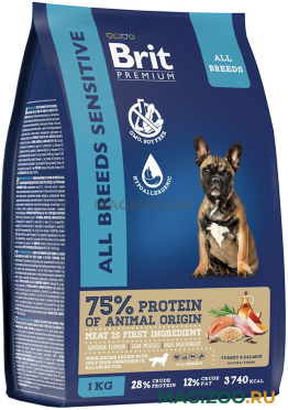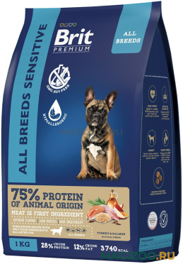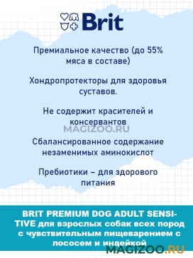 Полнорационный корм с лососем и индейкой для взрослых собак всех пород с чувствительным пищеварением.