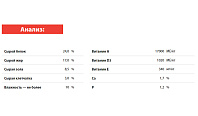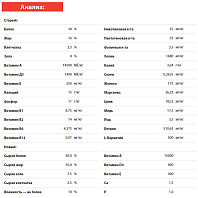 Аминокислоты, жирные кислоты, минералы, витамины на 100 г: Лейцин 2,34 г, Аргинин 1,85 г, Лизин 1,57 г, Валин 1,46 г, Фенилаланин 1,27 г, Треонин 1,09 г, Изолейцин 1,08 г, Метионин + цистеин 0,97 г, Гистидин 0,57 г, Метионин 0,57 г, Триптофан 0,25 г, Линолевая кислота (Омега-6) 2,34 г, Арахидоновая кислота 20 мг, Хлориды 0,31 г, Калий (К) 0,52 г, Натрий (Na) 0,19 г, Магний (Mg) 0,11 г, Цинк (Zn) 0,1 г, Железо (Fe) 22,58 мг, Медь (Cu) 1,87 мг, Марганец (Mn) 3,49 мг, Селен (Se) 0,53 мг, Витамин A 1500 МЕ, Витамин D3 90 МЕ, Витамин E (α-токоферол) 30 мг.