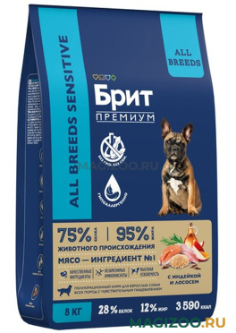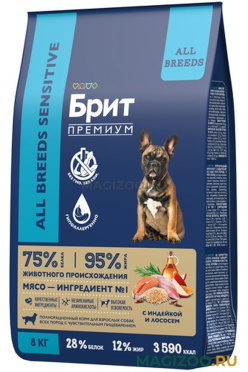 Полнорационный корм с лососем и индейкой для взрослых собак всех пород с чувствительным пищеварением.