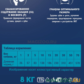Состав: дегидрированное мясо 32 % (в том числе лосось, индейка), ячмень, рис, маис цельнозерновой, жир куриный (источник Омега-6 жирных кислот), клетчатка свекловичная, маисовый протеин, мясной соус 2,5%, калий хлористый, дрожжи (источник маннанолигосахаридов), яблоко сушеное (источник пектина), рыбий жир (источник Омега-3 жирных кислот), витаминно-минеральный комплекс, топинамбур (содержит инулин - источник фруктоолигосахаридов), антиоксиданты (в том числе витамин Е), хондропротекторы (глюкозамин и хондроитин), экстракт юкки Шидигера.