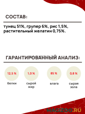 Состав: тунец 51%, групер 6%, рис 1,5%, растительный желатин 0,75%.