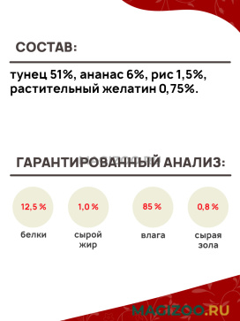 Состав: тунец 51%, ананас 6%, рис 1,5%, растительный желатин 0,75%.