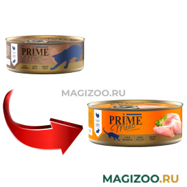 Prime Meat - линейка беззерновых влажных кормов из цельного 100% филе курицы или индейки с добавлением лосося, креветки, телятины, скумбрии. В состав также входят ягоды годжи и кокосовое масло.